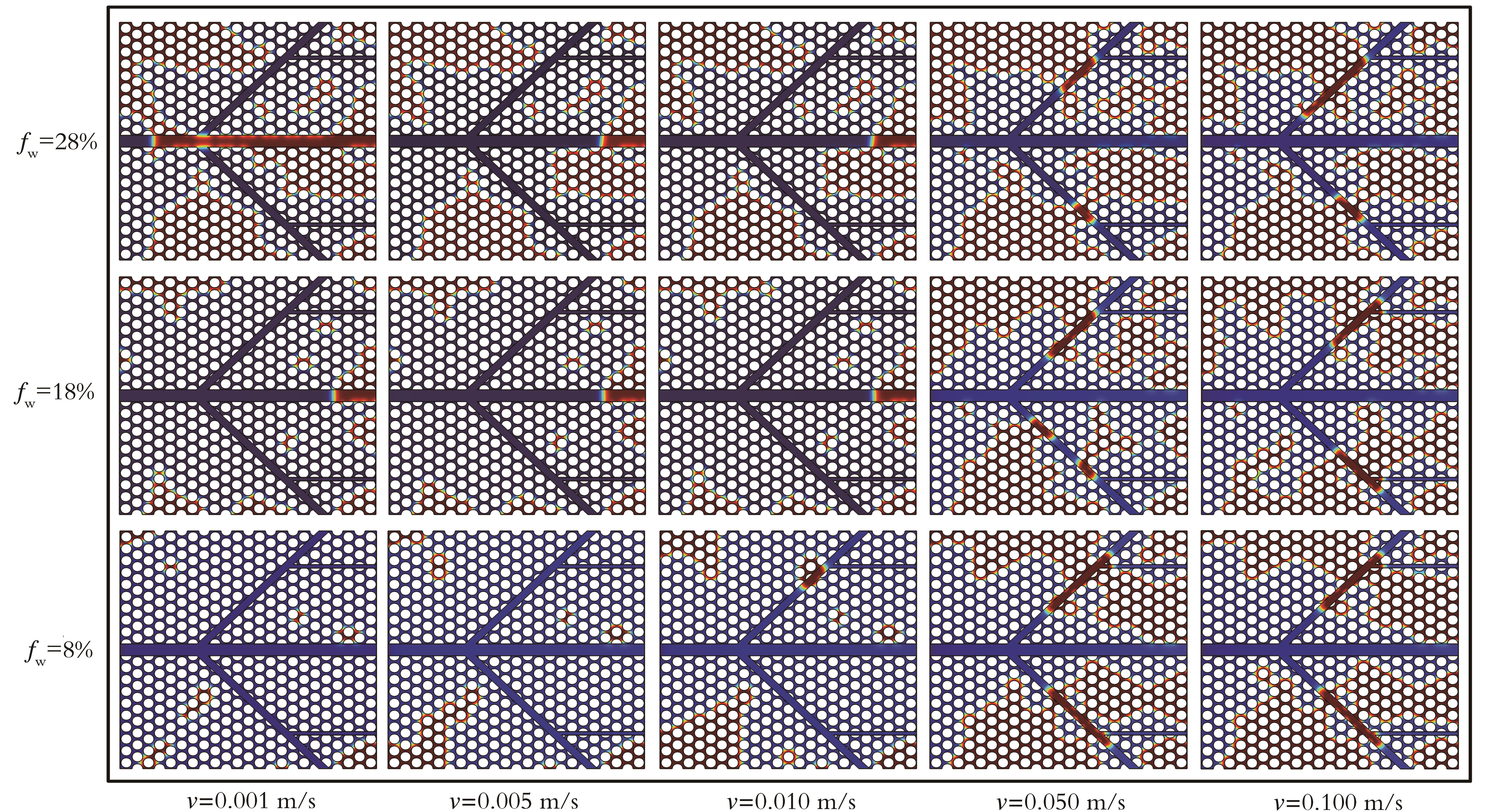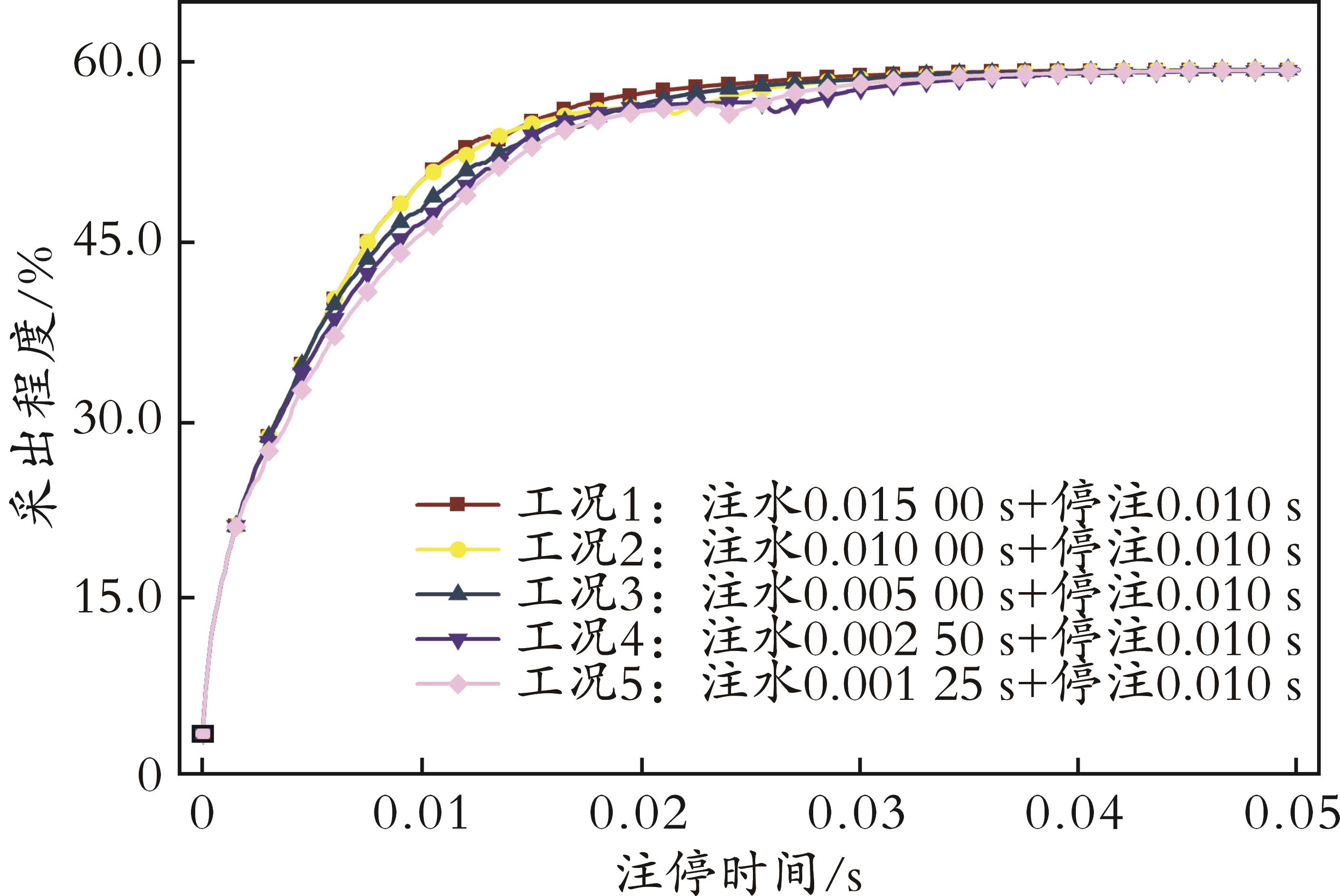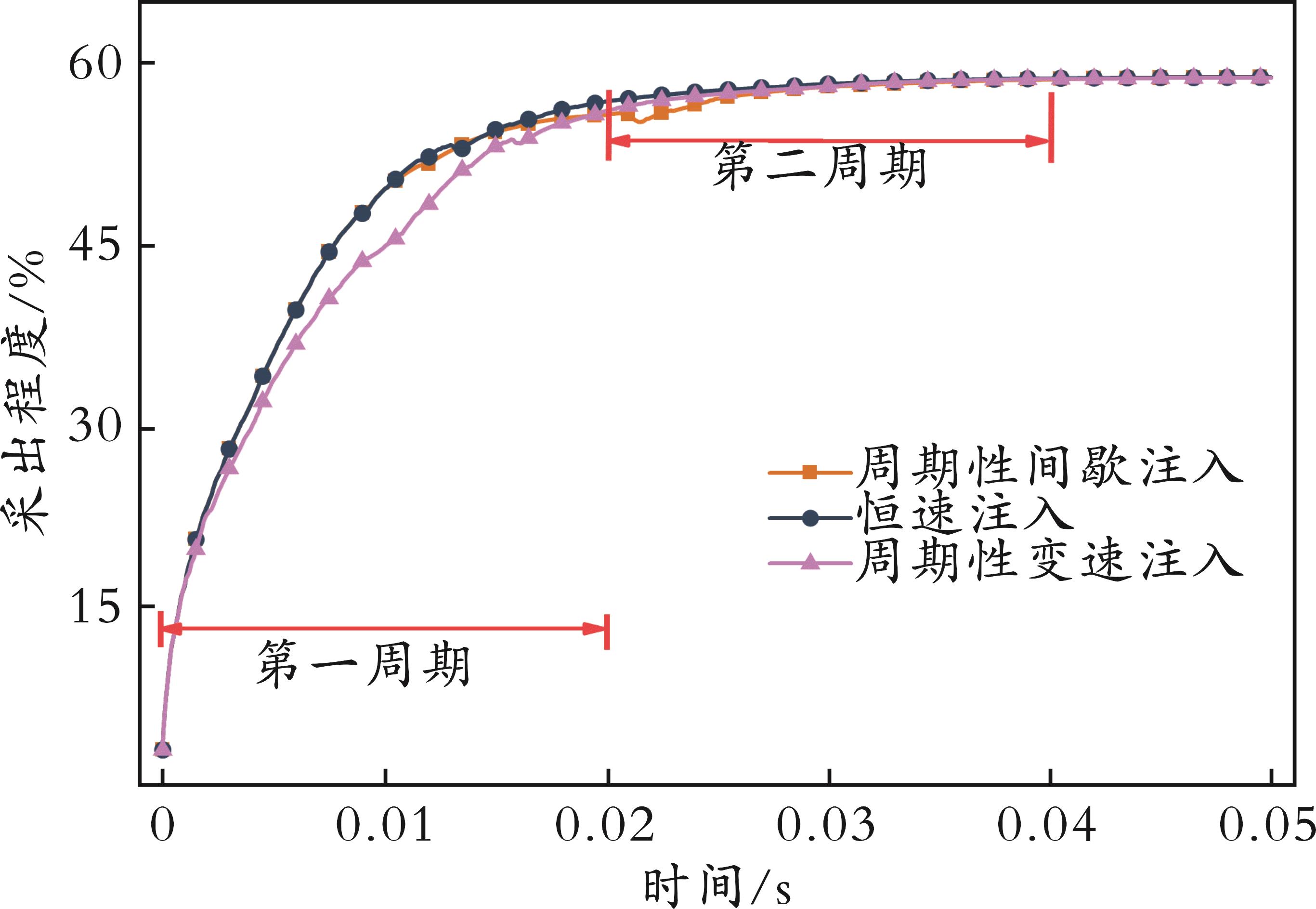 基于Navier?Stokes方程与相场理论耦合方法,构建了含裂缝混合润湿致密油藏孔隙尺度数值模型,研究了不同注入速度、注入方式及注停时间下的渗吸采油过程。结果表明,注入速度与采出程度呈非线性关系,0.01 m/s为最佳注入速度,此时毛细管力与黏滞力动态平衡,裂缝?基质压力传递效率最优,采出程度达峰值;周期性间歇注水方式较恒速注水可节水48%,而采出程度仅降低1.08%,在低油价下经济性更优;较短的注停时间配合高频次注水,可形成周期性压力波动,累计注水量减少80%,可实现与长周期注水相同的采油效果。研究混合润湿致密油藏注水开采过程中注入参数对渗吸?驱替协同增效机制的影响规律,为优化注入方式提供了理论依据。