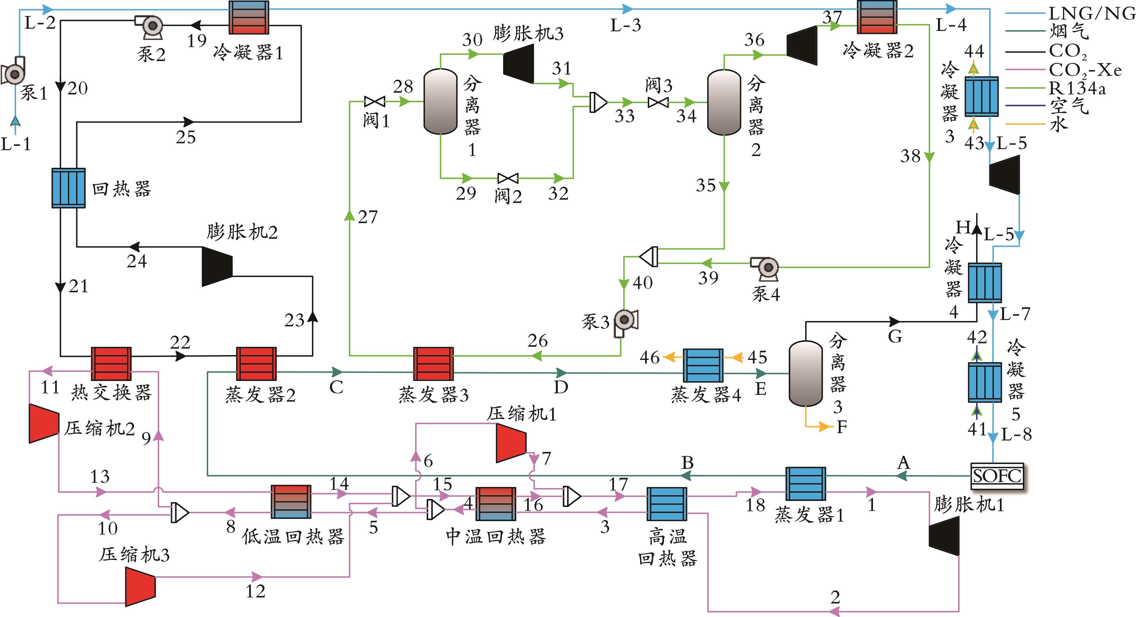 关键词: 固体氧化物燃料电池, 液化天然气, 余热回收, ?分析, 混合工质