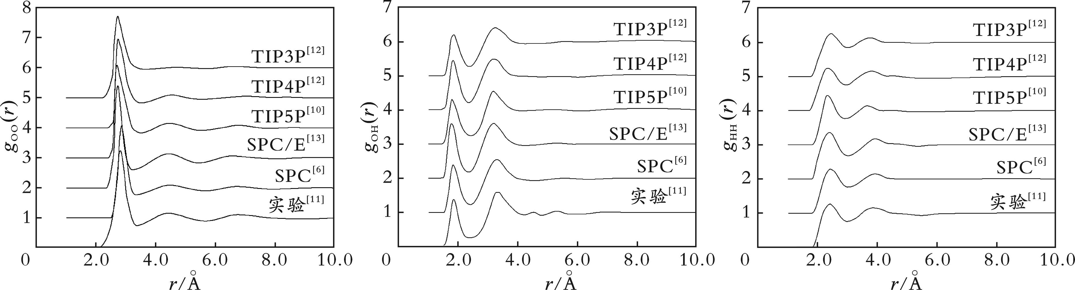 图2 常用水势函数模型模拟所得径向分布函数与实验测得径向分布函数的对比结果(a) gOO (b) gOH (c) gHH