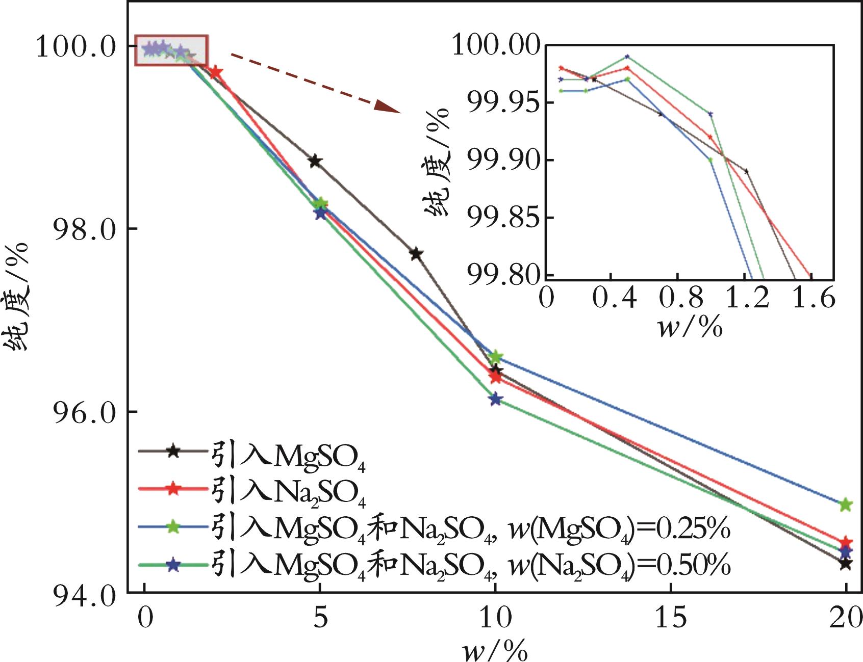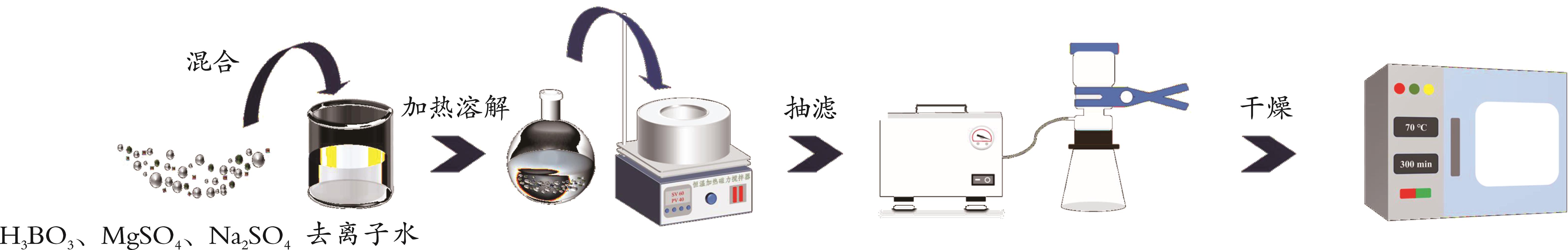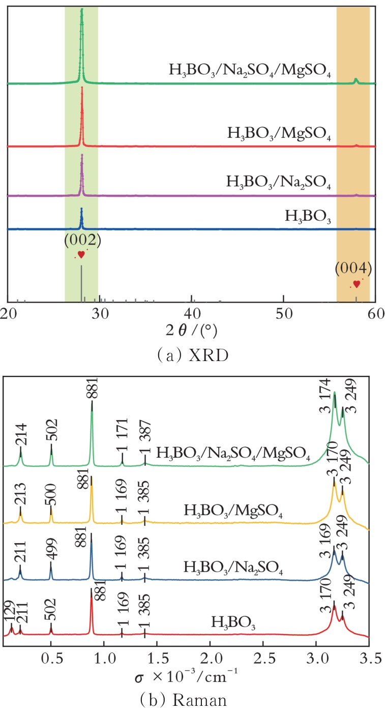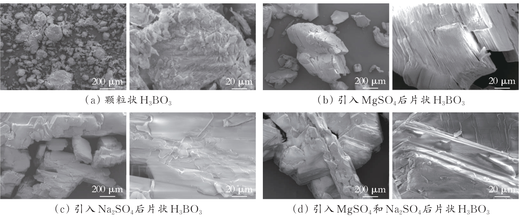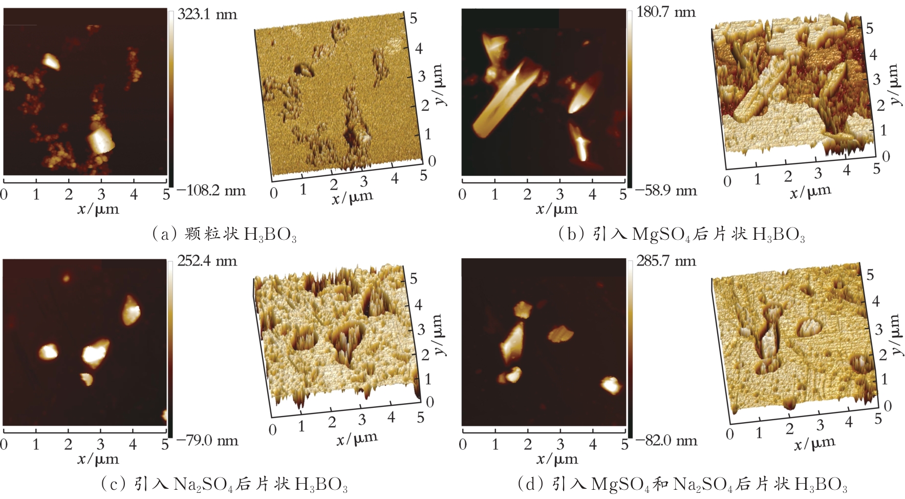 硼酸是重要的化工原料,其片状化技术的开发对提升产品性能与拓展应用领域具有关键意义。基于树脂(LSI⁃020/010)纯化的硼酸溶液体系,创新性地引入硫酸钠(Na2SO4)和硫酸镁(MgSO4),成功诱导硼酸晶体定向生长为片状结构;采用SEM表征添加助剂后硼酸的形貌特征,联用COSMO⁃RS模型与XRD分析了弱酸性条件下MgSO4/Na2SO4的引入对硼酸溶液溶解度及晶体晶面生长的影响,借助原位拉曼光谱探究了MgSO4/Na2SO4与硼酸晶体间的相互作用及其对B-O键能的影响。结果表明,添加助剂后的硼酸呈现典型片状形貌,弱酸性条件下MgSO4/Na2SO4的引入可显著降低硼酸在溶液中的溶解度、驱动晶体沿(002)、(004)晶面择优生长,且MgSO4/Na2SO4与硼酸晶体间的弱相互作用使B-O键能降低,推动硼酸晶体向片状化方向生长。该研究不仅建立了新型的高纯硼酸晶体片状化制备技术,更从分子层面阐释了其晶体生长调控机制,为功能化晶体工程的研究与应用提供了理论支撑。