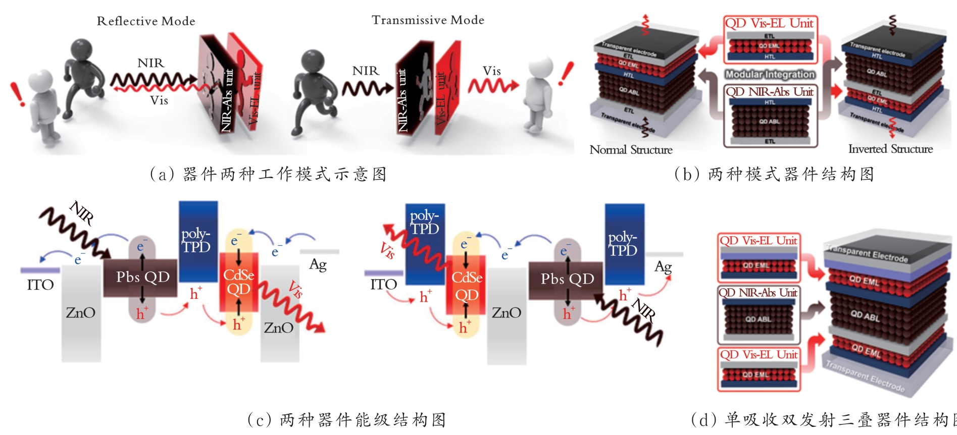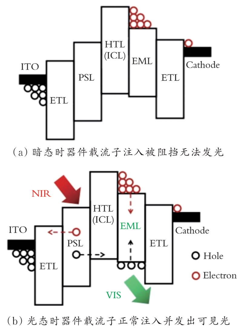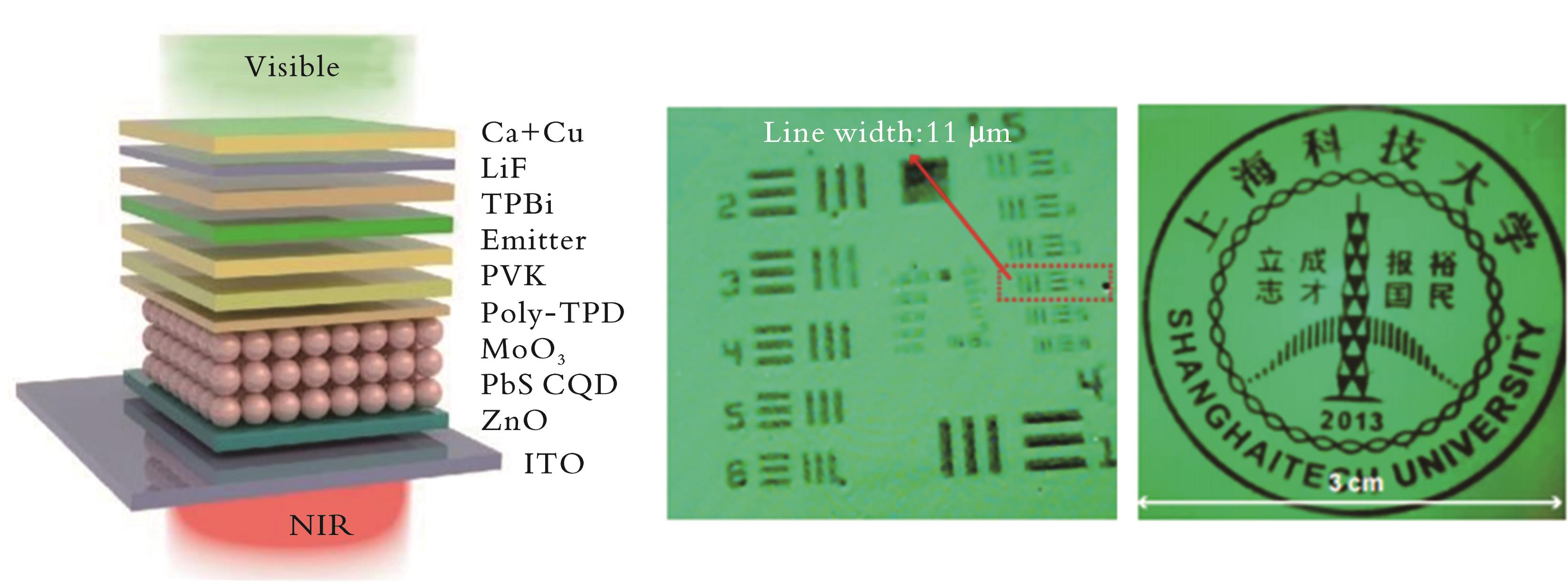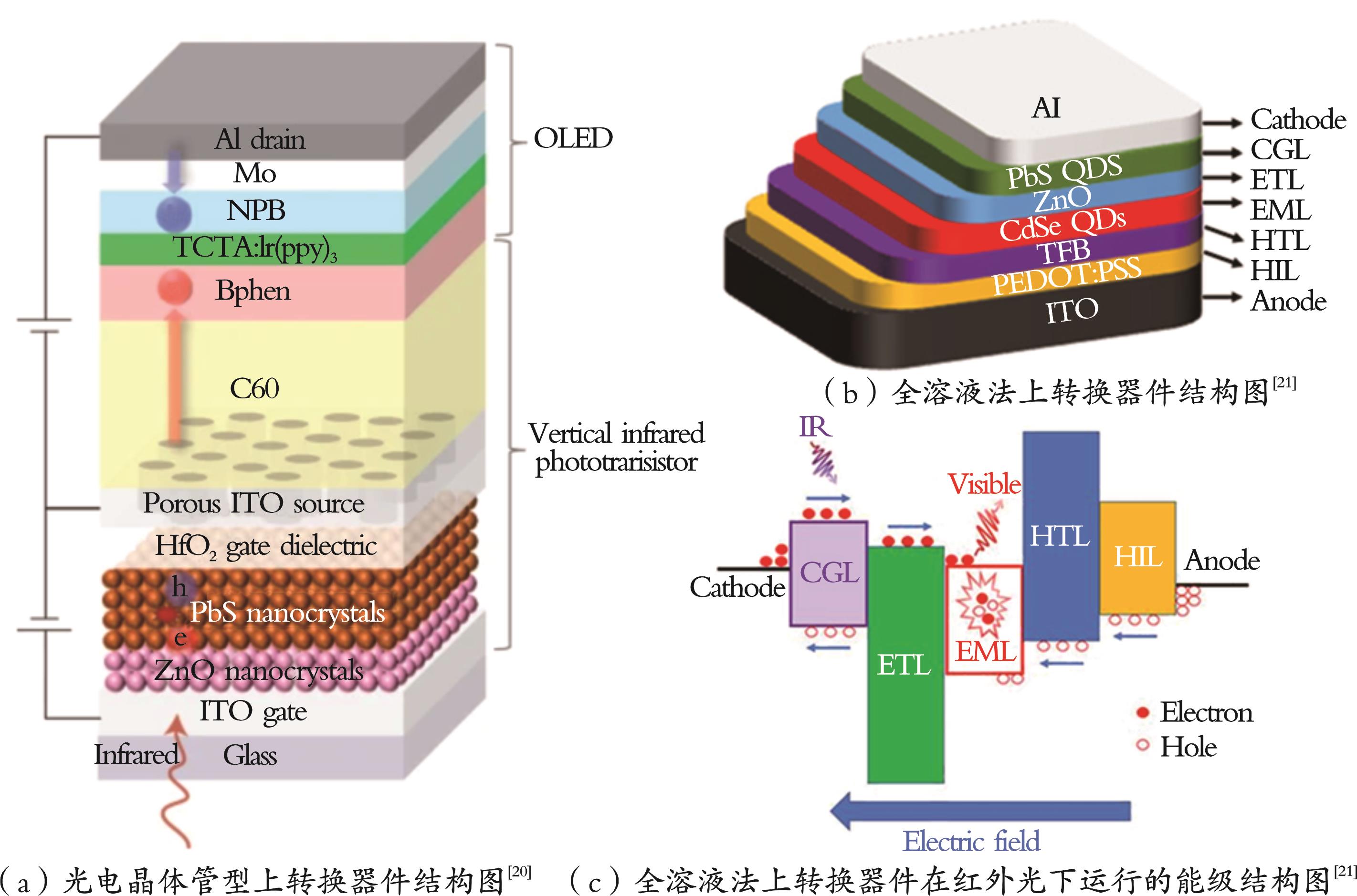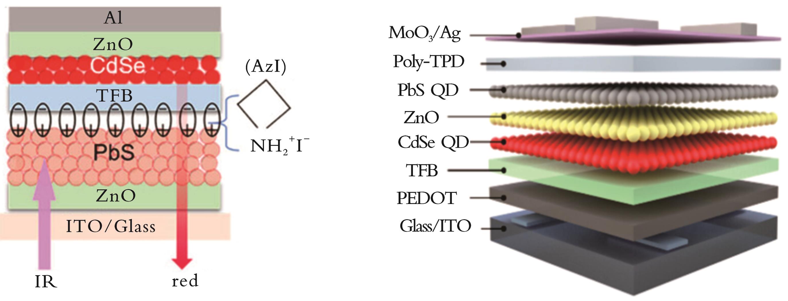 红外上转换探测器是一种由红外光电探测器(PD)和可见光发光二极管(LED)串联堆叠构成的器件,可将不可见的红外光信号直接转换为可见光输出或经CCD、CMOS相机等可见光成像设备实现成像。相比于传统电学读出方案,上转换路线无需读出电路与复杂算法,具有制备工艺简单和成本低廉等优势。胶体量子点(CQDs)兼具可溶液加工、带隙可调且与多种基底兼容等特性,为构建低成本、大面积且可在室温下工作的上转换器件提供了关键材料平台。简要概述上转换器件的工作机制,阐述量子点上转换器件的关键性能指标,并从发光材料调控、器件结构及界面调控两部分系统梳理近年代表性研究进展,最后对研究现状和挑战进行了总结,提出了若干研究方向与建议。