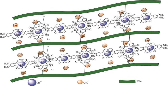 The quaternary ammonium group (QA) commonly used in conventional anion exchange membranes (AEMs) has a low dissociation constant with OH-, resulting in poor conductivity. The crown ether group can significantly enhance the ion exchange capacity (IEC) and OH- conduction efficiency of AEMs due to its ability to form positively charged complexes with alkali metal cations. Meanwhile, the ether bond in the crown ether ring exhibits good alkali and chemical stability. In view of the above advantages, a series of AEMs grafted with bi?crown ethers were successfully prepared by grafting dibenzo?18?crown?6?ether?modified polyvinyl alcohol (PVA) via metastable acid. The results showed that the bi?crown ether anion?exchange membranes exhibited higher OH-selectivity and chemical stability compared with the mono?crown ether membrane materials; the prepared AEMs exhibited good OH- selectivity and chemical stability in terms of electrical conductivity (conductivity of 165.5 mS/cm at 80 ℃), mechanical properties (tensile strength of 47 MPa at room temperature), and alkali stability (only 4.52% decrease in conductivity after immersion in KOH at a concentration of 6 mol/L for 168 h), and the high efficiency electrolysis of water to produce hydrogen based on platinum charcoal as the anode material, and the efficiency of electrolytic reduction reached 80%.