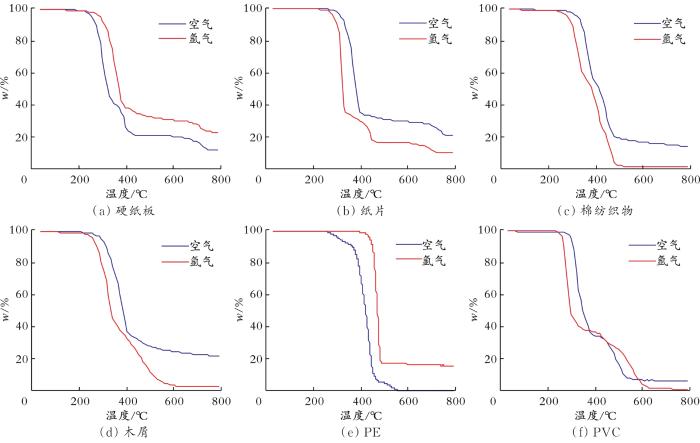 2.2 单组分垃圾样品在空气和氩气气氛下失重特性