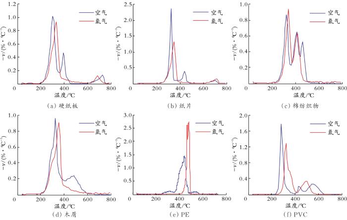 (1)6种典型垃圾组分在空气和氩气气氛下的失重规律各不相同。除PE外,其他5种典型垃圾组分在空气气氛下比氩气气氛下多一个残余固定碳的焚烧过程。