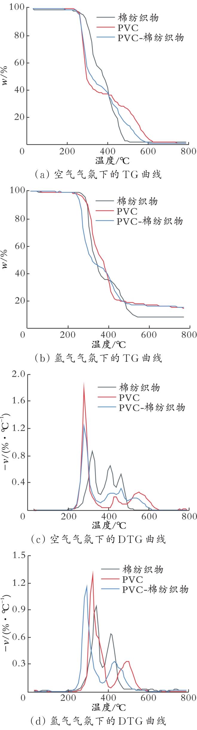 图3为PVC、棉纺织物及其混合物在空气和氩气气氛下的TG和DTG曲线。