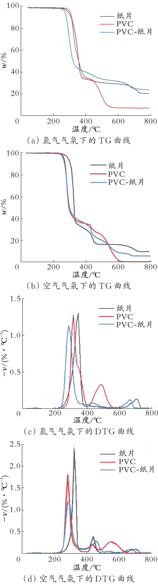 图4为PVC和纸片在空气和氩气气氛下的TG和DTG曲线。