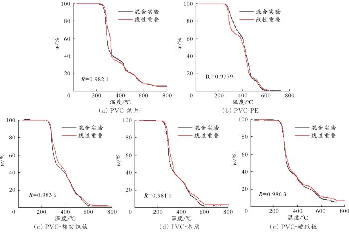 式中,ts为起始温度,℃;te为结束温度,℃;ms为起始质量,g;me为反应结束时的质量,g。N的数据来自于TG曲线,理论上N是无穷大的,但根据定积分的定义,当N足够大时其差值很小。R介于0与1之间,R值越接近1,证明两种物质的交互作用越弱;R值越小,证明两种物质交互作用越明显;当R=1时,证明两种物质之间不存在相互作用。从图5可以看出,硬纸板和PVC的交互影响最强,重叠率为0.986 3;PE和PVC的交互作用最小,重叠率为0.977 9。各组分与PVC相互作用大小顺序为PE>木屑>纸片>棉纺织物>硬纸板。